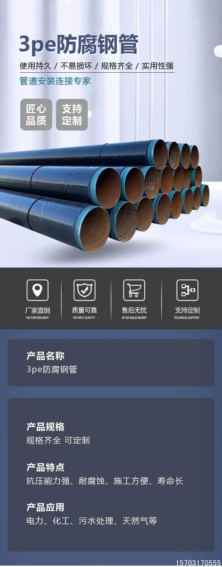 内壁及外壁底层采用中频加热熔结环氧粉末,大大提高了涂层的附着力,外壁缠绕聚乙烯层大大增强了耐磕碰性能;韧性高,防应力裂变性强,抗冲击性能好(冲击强度≥8J/mm)。