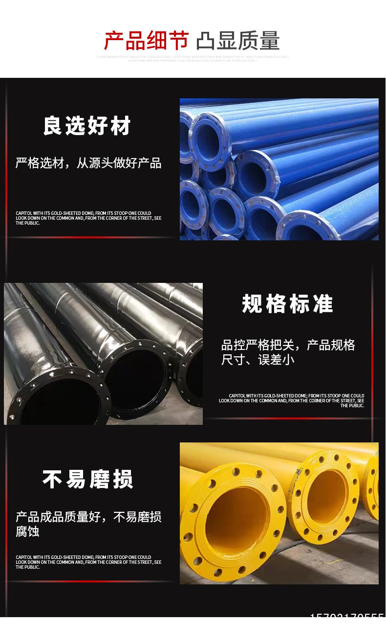 公司对产品有严格的检测手段,从原材料检验到成品,每一环节均严格把关,严控产品质量。产品广泛应用于市政工程,供水管道,供热管网,煤气管网,煤井矿山,通风管道,建筑工程,钢结构等领域。同时,公司连续几年取得广东省守合同重信用企业证书,“诚信、求实、拼搏、奋进” 是企业精神,致力于为客户提供优质的产品和服务。